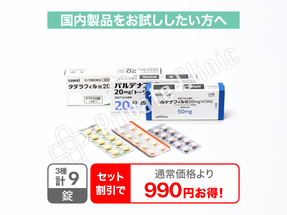 自分の身体やライフスタイルに合った薬がきっと見つかる。さまざまなシーンでの使い分けも試せる、3種類の国内製ED治療薬飲み比べセットです。